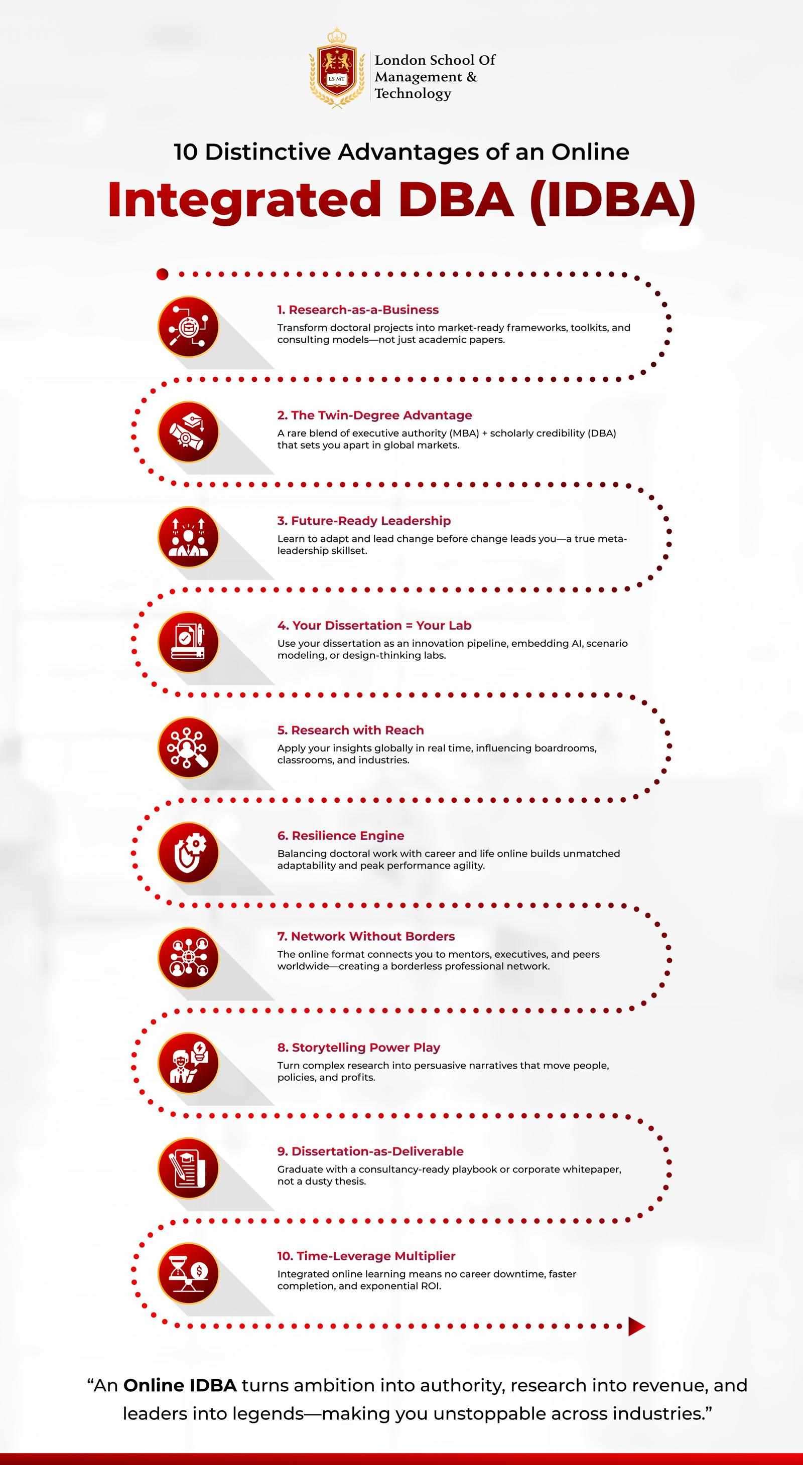 The London School of Management & Technology delivers the power to transform lives through its Online Integrated DBA across 10 distinct benefits. The program adopts a “Research-as-a-Business” model; in other words, doctoral projects are not aimed at the usual way of academic papers but rather market-ready frameworks, toolkits, and consulting models. It also grants the patient a “Twin-Degree Advantage,” combining an MBA with a DBA, and thus enhancing its global stature and academic recognition.